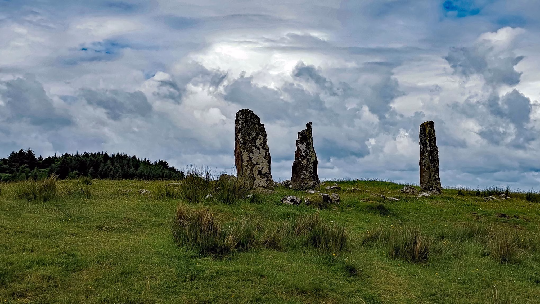 On a low ridge overlooking the northern landscape of the Isle of Mull, the Glengorm Standing S..