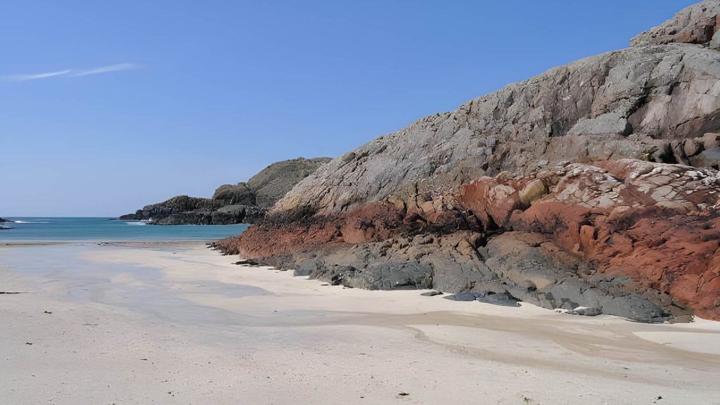 The location of this beach makes it one of the quietest on the island, a perfect reward for those who seek solitude away from the more popular areas. It is an excellent place for exploring the richly coloured, twisted rocks and for discovering unique shells and sea-polished glass. The views from here are exceptional, stretching out across the Atlantic to the islands of Coll, Tiree, the Treshnish Isles, and on a clear day, even to the peaks of Skye and Rum.