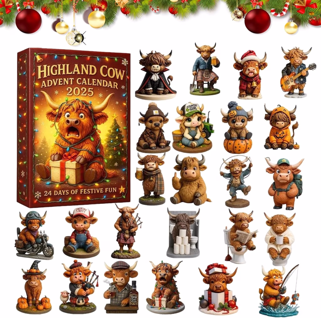 Premium Durability & Lasting Quality – Highland cow advent calendar is crafted from sturdy, shatter-resistant resin. 24 Days of Daily Surprises – Highland cow christmas celebrates the countdown to Christmas with 24 individually designed Highland cow ornaments, This 2025 Highland Cow Advent Calendar includes 24 unique mini cow ornaments.