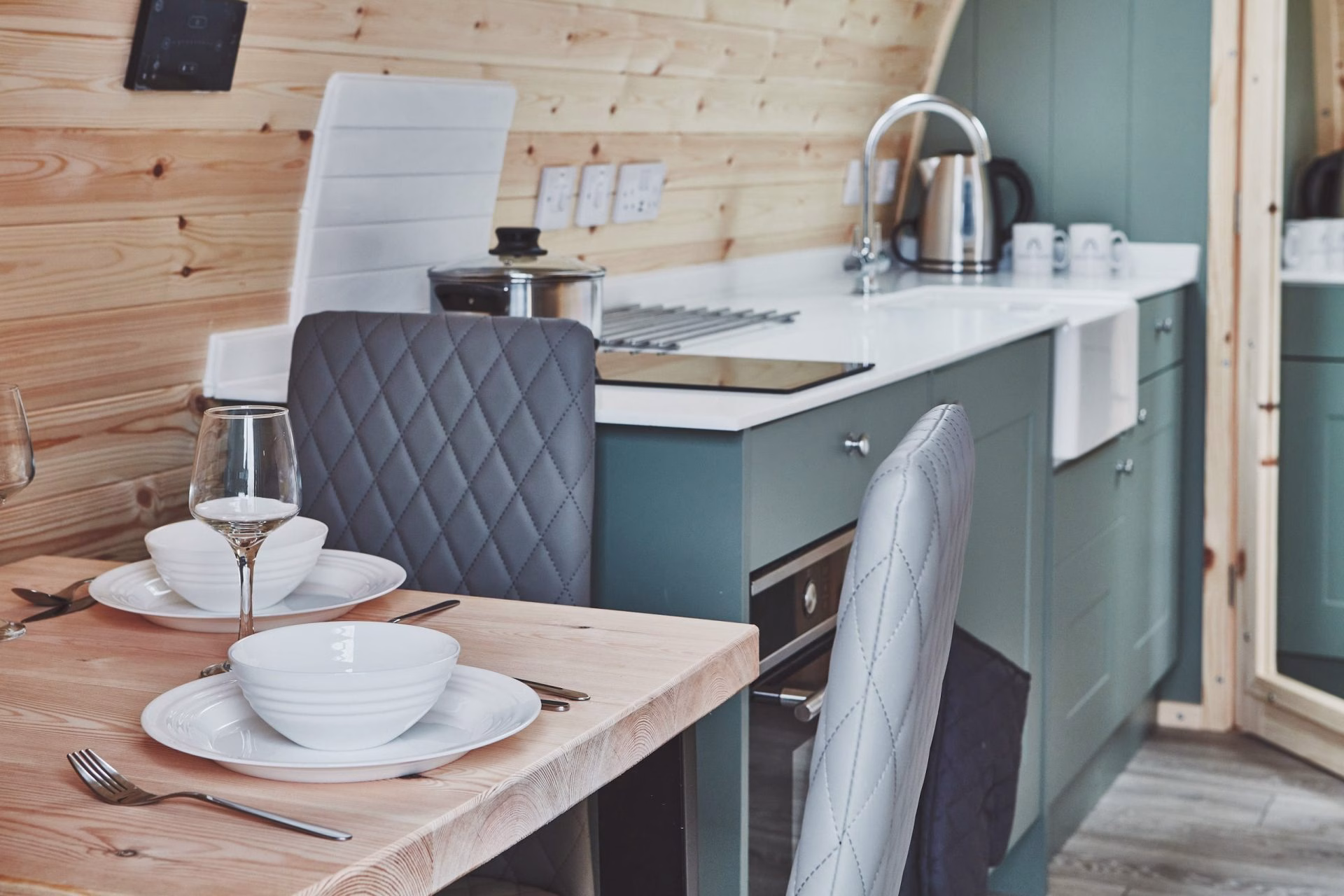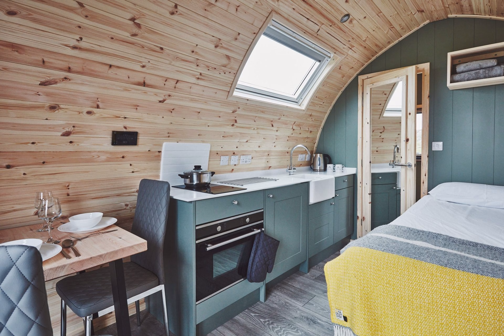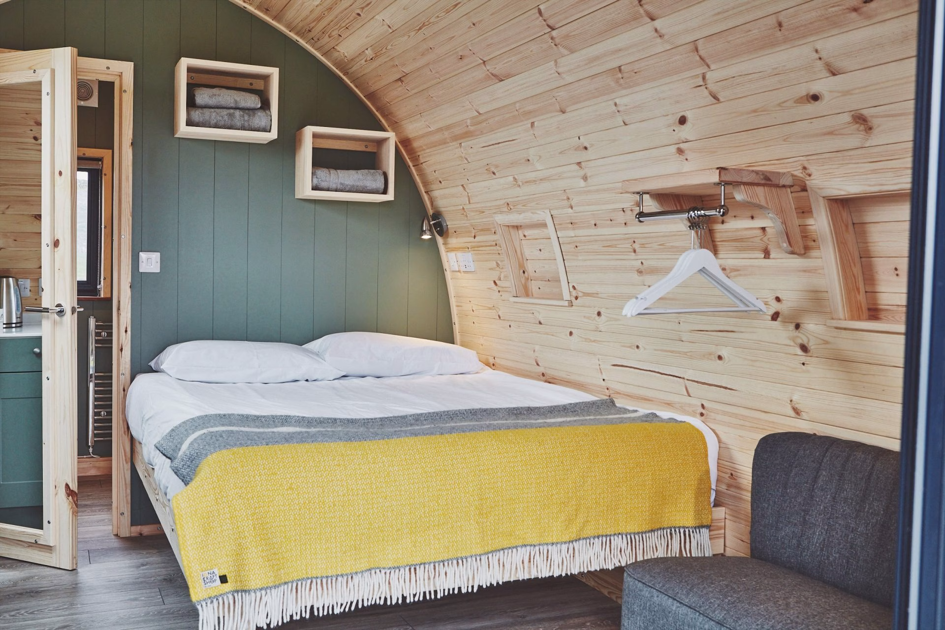 Each individual pod is thoughtfully designed to provide a comfortable and compact living space. Internally, they typically consist of a single open-plan area featuring a double bed and additional single beds, accommodating up to four guests. For convenience, the pods are equipped with basic self-catering amenities such as a kettle, fridge, microwave, electric hob, and essential kitchenware and cutlery. Power sockets and heating ensure a comfortable stay, allowing guests to relax and recharge after a day of island exploration.