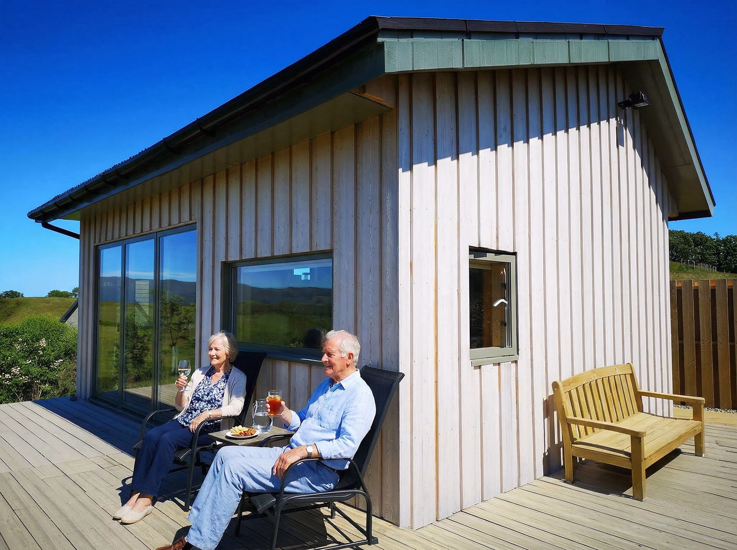 Inside the studio, guests will find a well-equipped kitchen and a comfortable living area featuring leather armchairs positioned to make the most of the three-metre-wide patio windows. The sleeping area contains a king-sized ottoman bed, while the en-suite bathroom includes a modern walk-in shower. Large sliding doors lead out to a private decking area, which is an ideal vantage point for spotting resident wildlife such as sea eagles, hen harriers, and red deer.