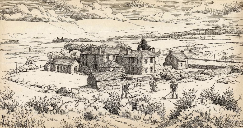 The poorhouse accommodated approximately 130 inmates, a number determined by the population and projected demand from the seven parishes. Construction cost totaled roughly £7,700, equivalent to around £950,000 in today’s money, reflecting a substantial investment by the combined parishes according to union financial accounts. Architectural features reflected the functional style typical of mid-Victorian Scottish poorhouses, with separate entrances for male and female wings limiting interaction and a central hall providing space for meals and religious observances. Builders used local stone, and contemporary accounts describe the construction as standard for institutional buildings of the period.