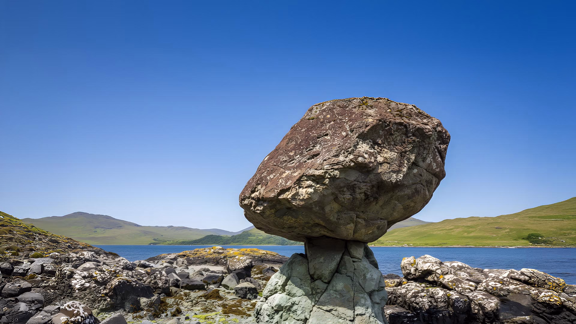 The Croggan Mushroom Stone tells a geological story that stretches back millions of years. Much of Mull was born from ancient volcanic activity, leaving layers of lava and softer sedimentary rock. Over time, the contrast between these rock types shaped this incredible feature.