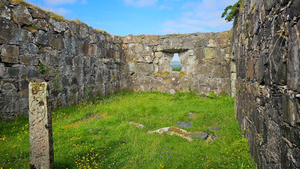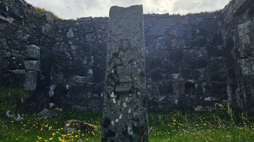 Inside the ruin stands a Celtic cross shaft dating to the period between 1500 and 1560. The lower part of the shaft features the usual island ship, showing a raised stem and stern, a tall mast and a long cross-yard. Above the ship sit foliated designs with leaves like clover, and a griffin is also carved into the stone. On the other side, a Virgin and Child carving shows the community’s devotion.