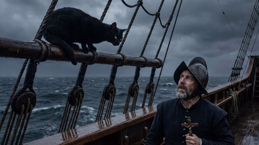 The Great Gormal of Moy, a witch from the mainland district of Lochaber, arrived to assist. Possessing powers that exceeded those of the island witches, she did not join the line on the rope. Instead, she transformed herself into a black cat, ran down to the shore, and swam out to the Spanish ship. Climbing up the side of the hull, she perched on the rigging to look down at Captain Forrest.