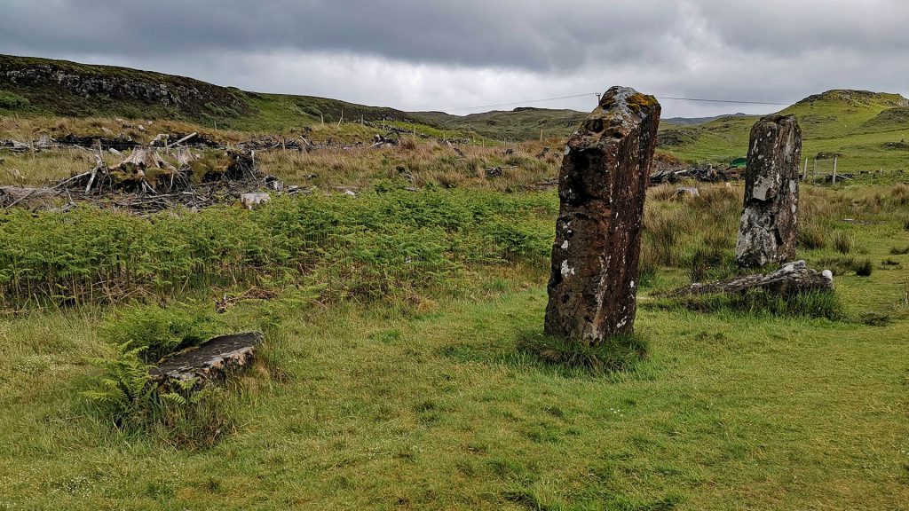Near Dervaig, the Kilmore stones are remnants of a Bronze Age megalithic alignment. Two upright stones remain, standing approximately 2.5 metres high in a woodland setting.
