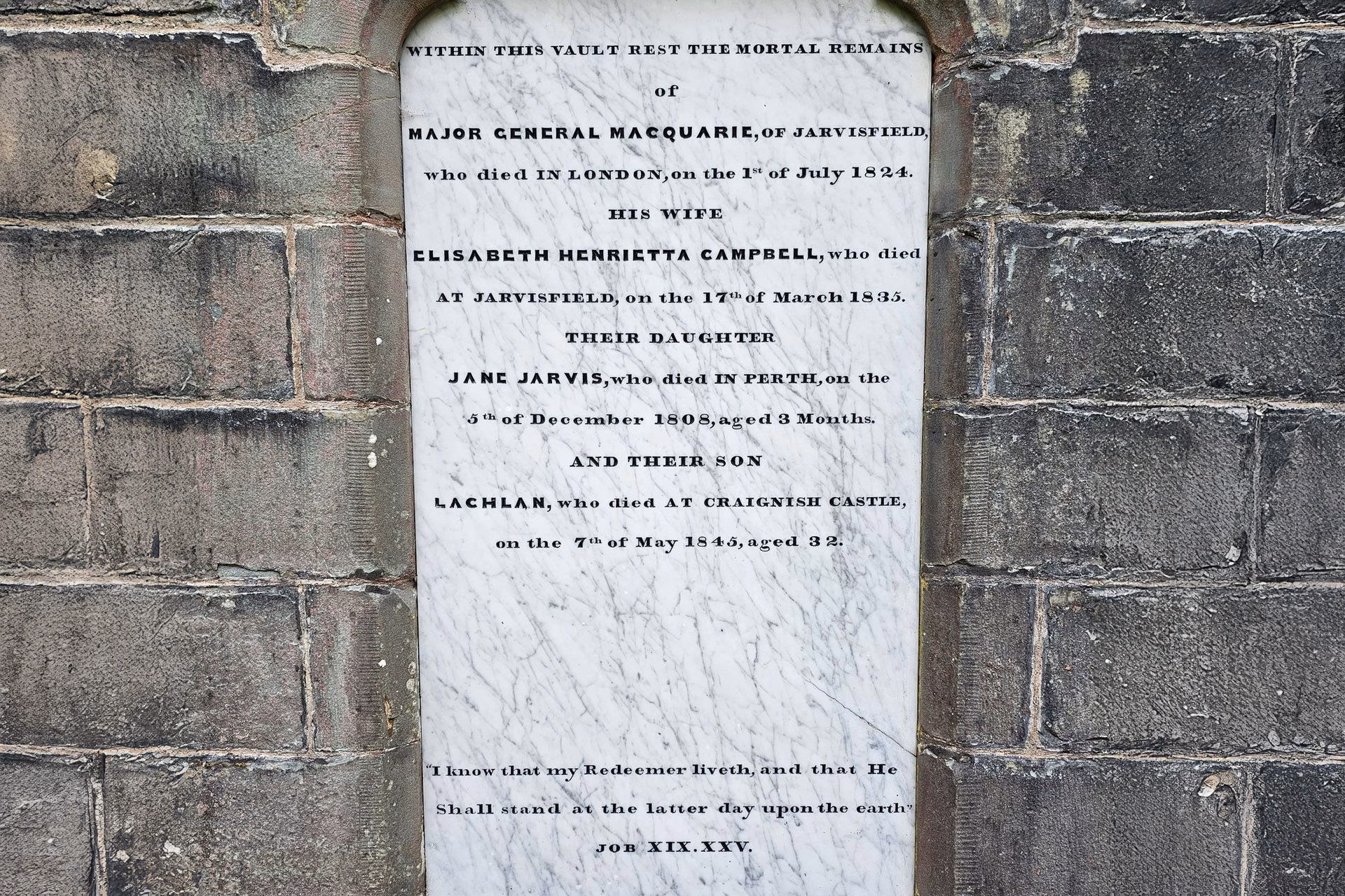 The original doorways were sealed with two memorial panels. One, made from red Peterhead granite, commemorates Lachlan Macquarie. The other, carved in white Carrara marble, honours Elizabeth and their children. Although Elizabeth is buried in London, she chose to install her memorial at Gruline beside her husband’s.